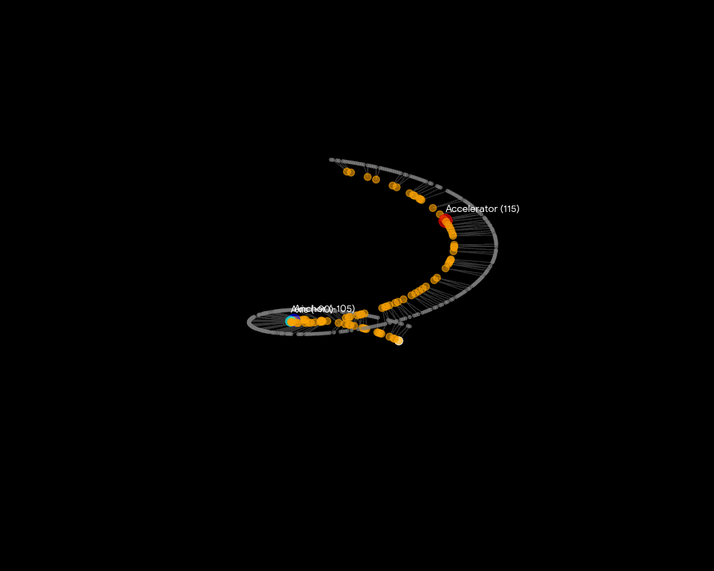 Kod koncentruje się na trzech kluczowych węzłach: Kotwicy (-105), Osi (-90) oraz Akceleratorze (115).