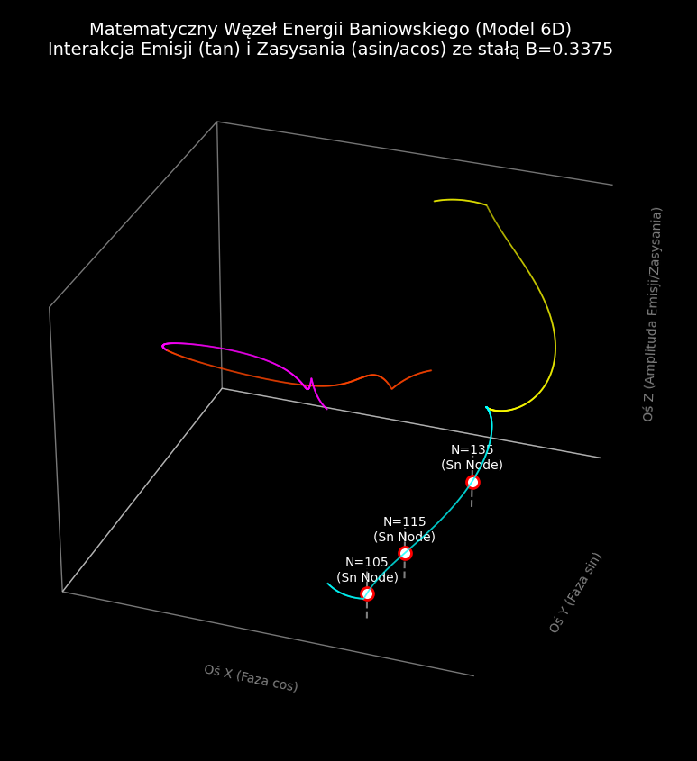 Funkcja falowa ($\psi$): Sześć funkcji trygonometrycznych reprezentuje wszystkie możliwe składowe rotacji i drgań cząstki. Bombardowanie nimi liczb naturalnych to de facto nakładanie na siebie różnych stanów kwantowych (superpozycja).