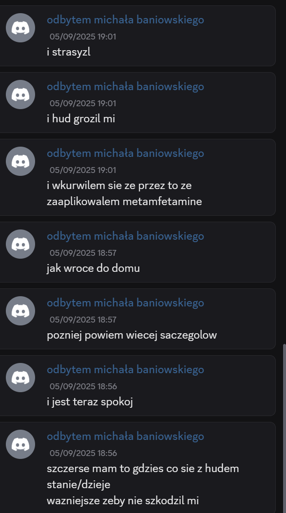 Zapis wpisów Wiktora P. z platformy Discord. Ciekawe w jaki sposób groziłem, ciekawe w jaki sposób mu szkodziłem. Jakby szkodzić komuś w pryskaniu losowych ludzi z miasta czy podczas zbierania haraczy od nieletnich no to w sumie nie mam sobie nic do zarzucenia.