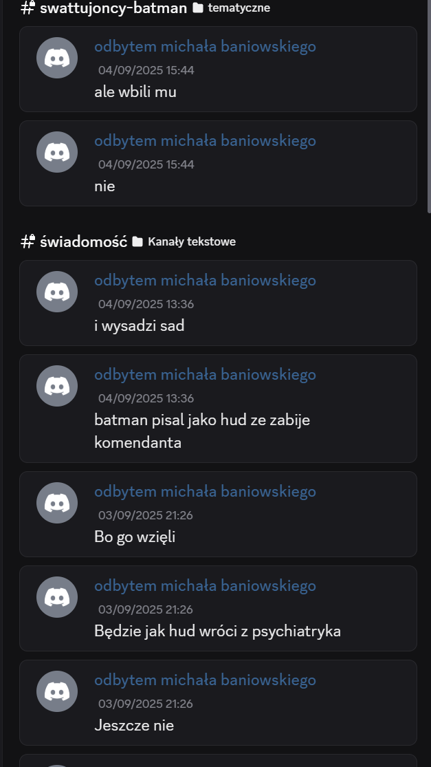 Zapis wpisów Wiktora P. z platformy Discord. Wiktor P. chciał mi załatwić i psychiatryk i więzienie. To było po tym, gdy olałem jego całkiem wyrafinowane groźby śmierci.