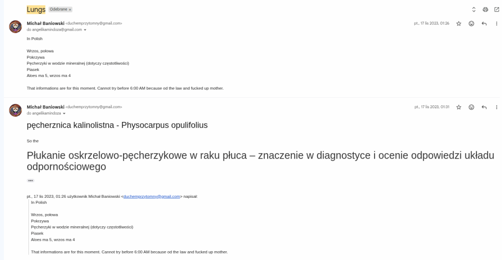 Pamiętam, bo byłem wtedy na pogrzebie i nie mam najmniejszego zamiaru zapierdalać na pogrzeby do jebanych kościułkuw i uczestniczyć w tym rytuale “płaczmy po nim bo go zabili”. Więc pamiętam, że twarz miał trochę inną, a na pewno był trochę niższy leżąc w trumnie. Lub mi się wydawało. Usta miał sine, spuchnięte wargi. Na szyi brak widocznych śladów samobójstwa sposobem typu: “powiesił się na rurce od gazu – w przedpokoju”, lub “powiesił się w łazience – na kaloryferze”, a pierwsza narracja Barbary Baniowskiej (rzekomej matki Michała Baniowskiego (Hud Hatmana)) oraz Heleny Duraj (rzekomej babci Michała Baniowskiego – Hud Hatmana) brzmiała: zmarł na zawał.