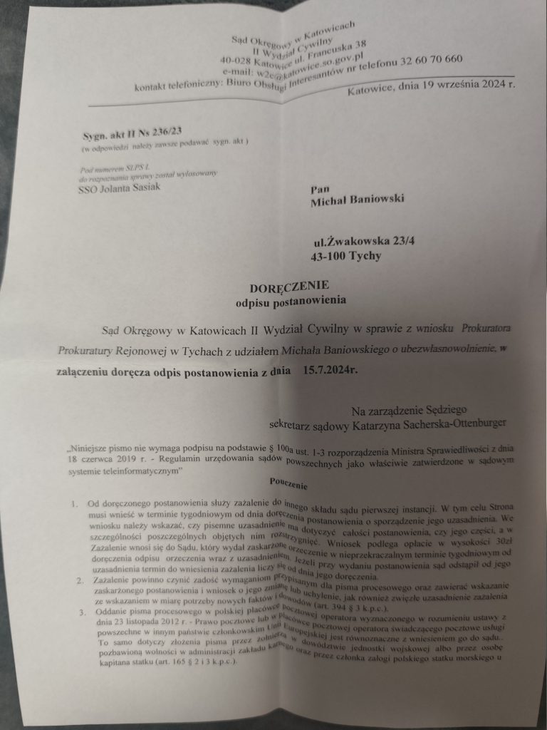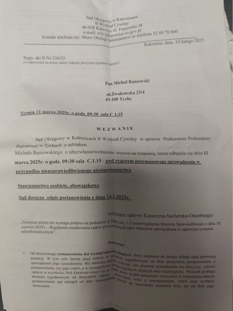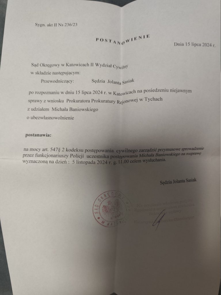 Na bezzasadny wniosek prokuratora z Tychów, który nie zapoznał się z moim staniem zdrowia rozpoczęto sprawę w Sądzie Okręgowym Katowicach dotyczącą ubezwłasnowolnienia całkowitego na jego wniosek – co jest potencjalnie docelowym naruszeniem art. 32. Konstytucji Rzeczypospolitej Polskiej.